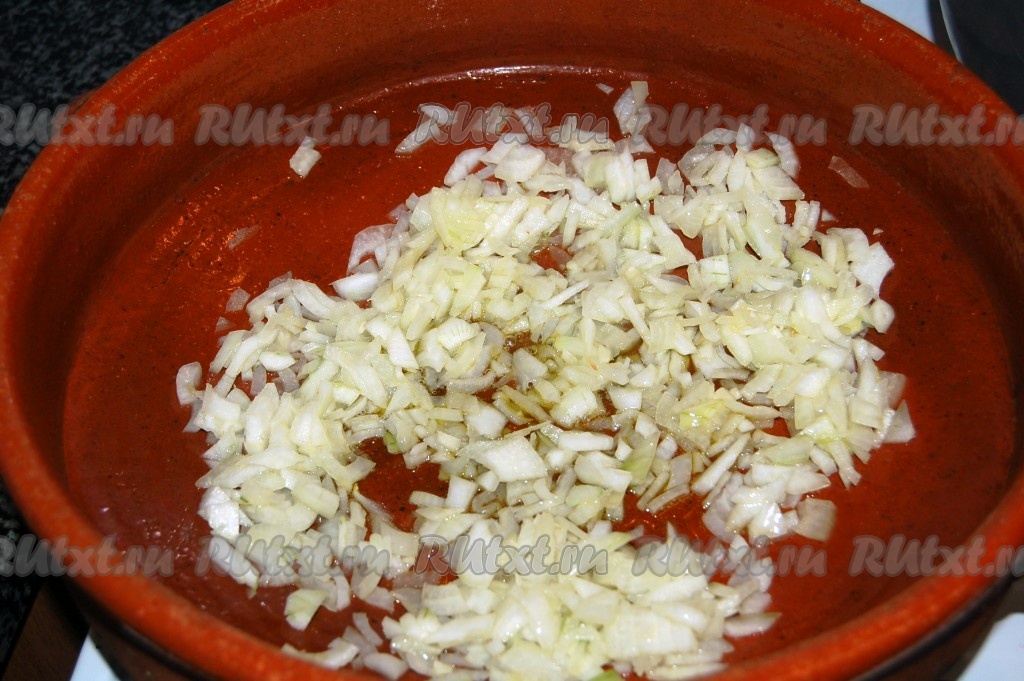 Лук очистить, мелко нарезать. На сковороду налить оливковое (или подсолнечное) масло, выложить нарезанный лук и обжарить его до прозрачности (в течение 3-4 минут), иногда помешивая, на среднем огне.