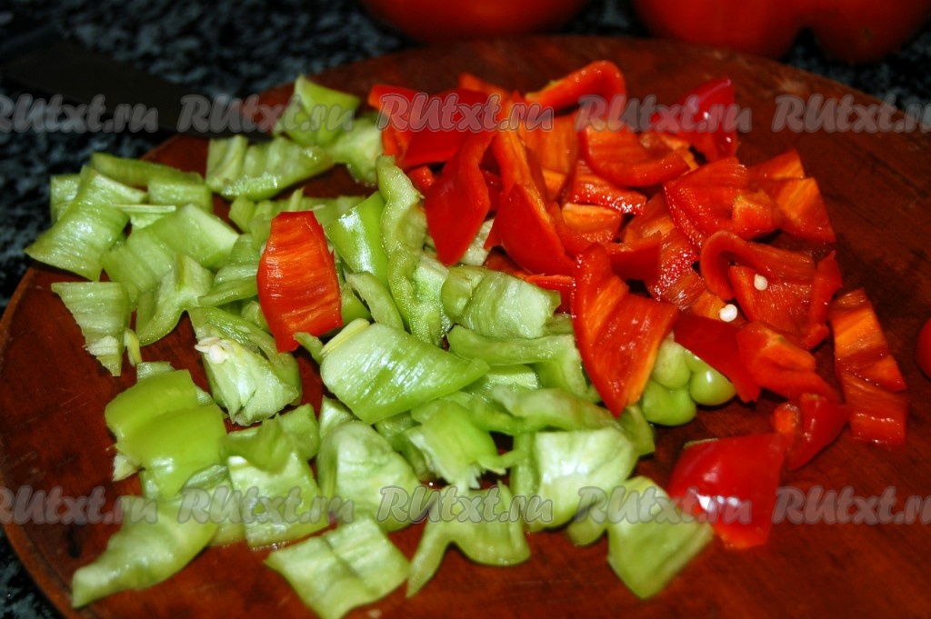 Из болгарских перцев (у меня перцы красного и зелёного цветов) удалить семена и плодоножки, промыть водой. Нарезать перцы на небольшие кусочки.