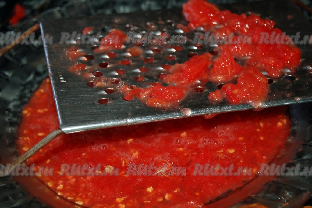 Натереть помидоры на тёрке так, чтобы шкурка осталась в руке.
