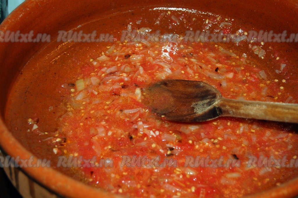 Натёртые помидоры добавить к луку и обжаривать их вместе, часто помешивая, 2-3 минуты.