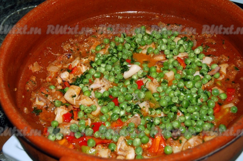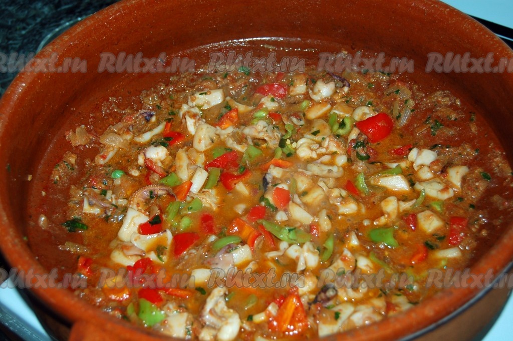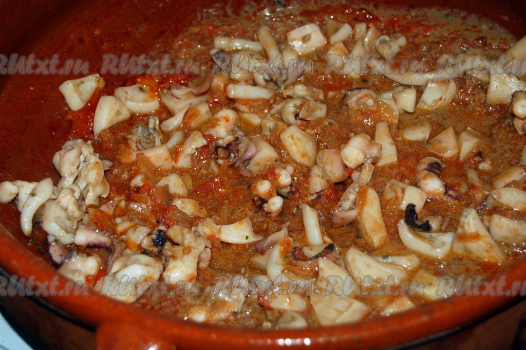 А теперь начнем постепенно собирать нашу домашнюю паэлью. К натёртым помидорам, обжаренным с луком, добавляем морепродукты, перемешиваем и тушим минут 7 на небольшом огне, иногда помешивая.