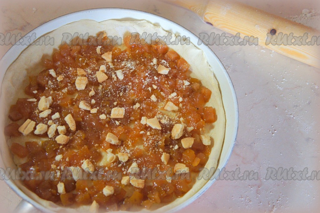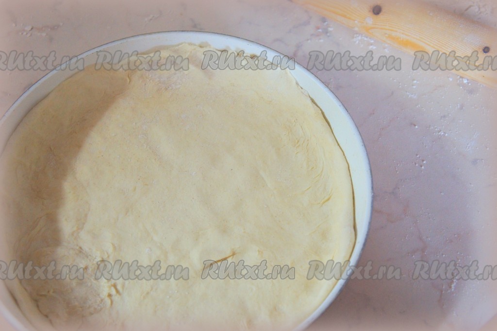 Тесто разделить на две части. Рабочую поверхность посыпать мукой, раскатать одну часть теста так, чтобы она было чуть больше диаметра сковороды, застелить им дно сковороды.