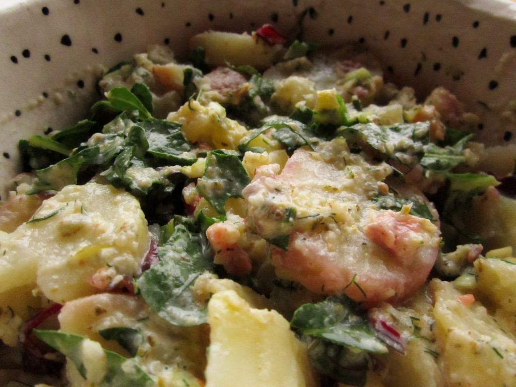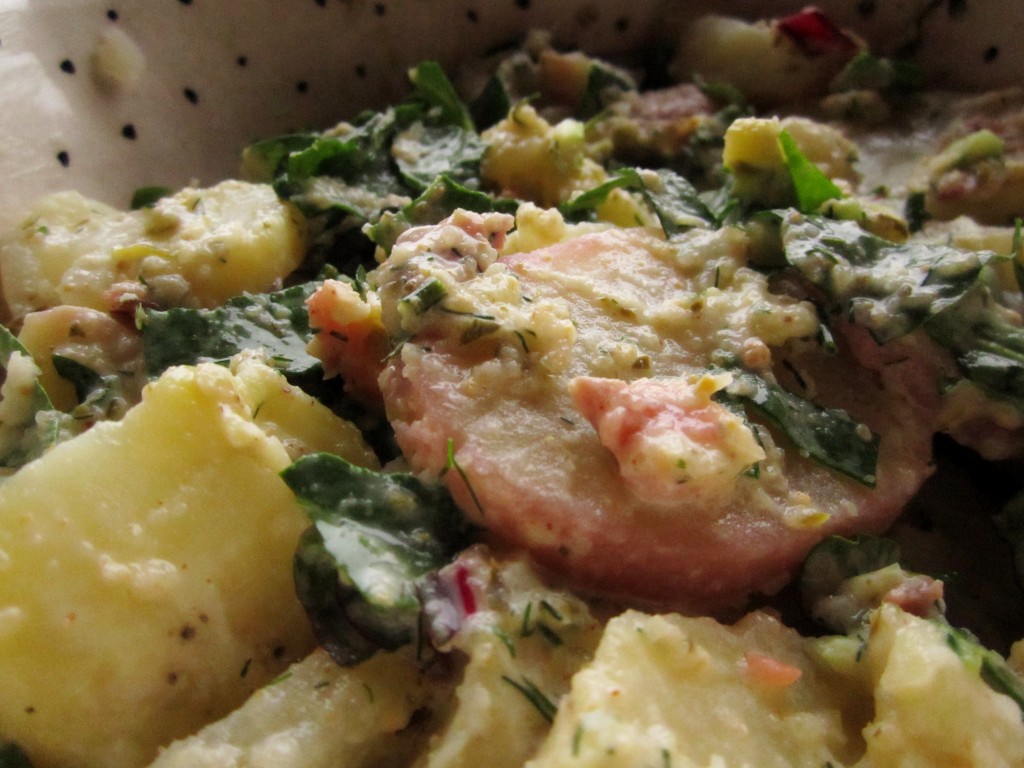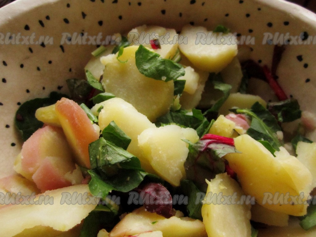 Когда картофель будет готов, дать ему немного остыть, чтобы легче было его чистить и резать. Очистить картошку от кожицы и нарезать тонкими кружочками. Перемешать с листьями салата (мангольда).