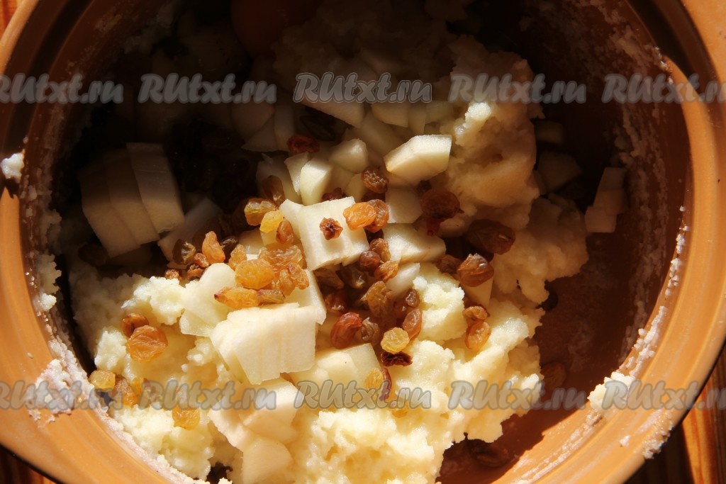 К остывшей манной массе добавляем изюм, мелко порезанное, очищенное от кожуры и семечек яблоко, желтки и миндальную муку. Все тщательно вымешиваем.