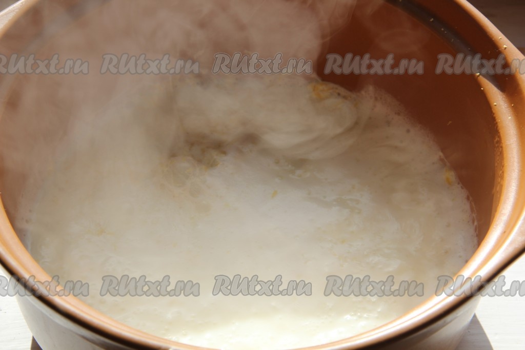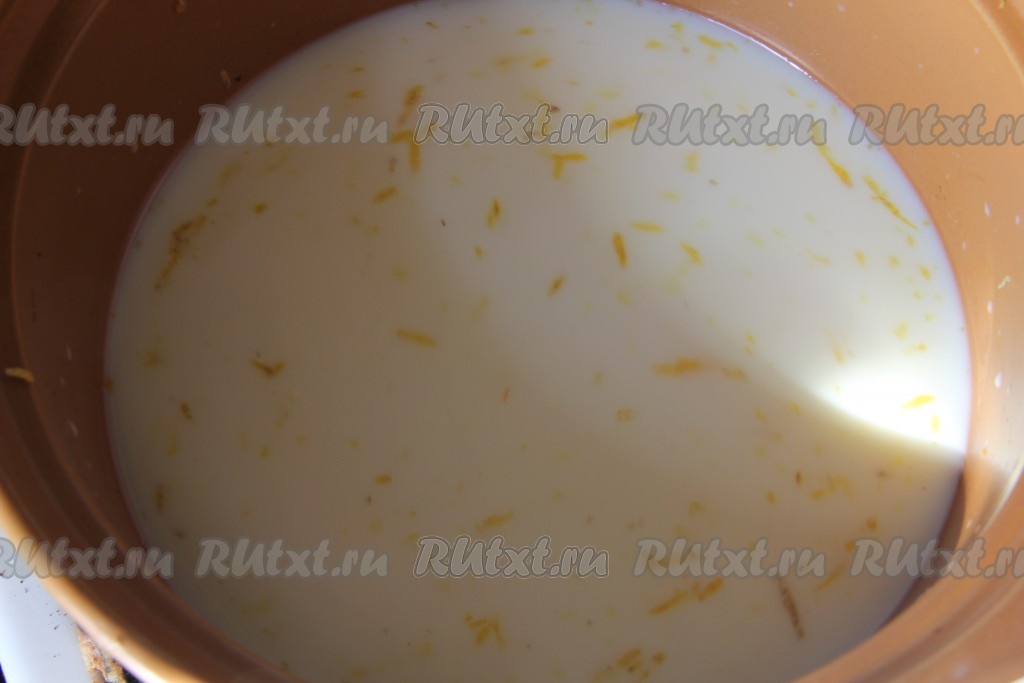 В молоко добавляем сахар, соль, ванильный сахар и цедру лимона или апельсина. Доводим до кипения.