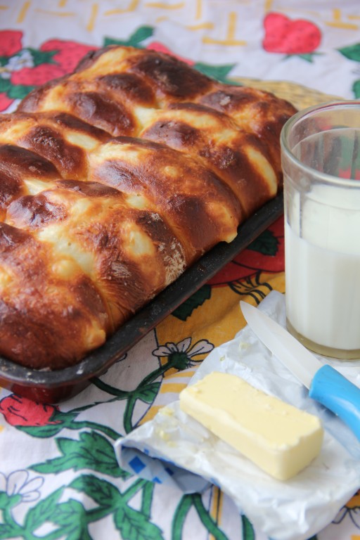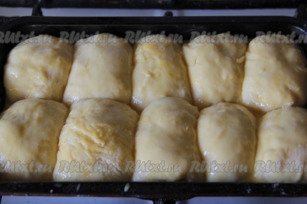Подошедшее тесто обмять, разделить на 10 равных частей. Из каждой части теста сформировать овальную булочку и выложить их на небольшом расстоянии друг от друга, прикрыть полотенцем и оставить на 30-40 минут для подъёма. Подошедшие булочки смазать взбитым яйцом.