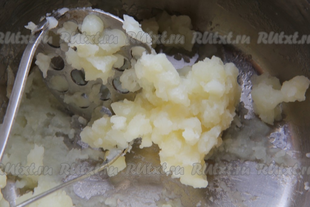 Картофель очистить и отварить до готовности (варим 25-30 минут с момента закипания воды), затем лишнюю воду слить и растолочь толкушкой в однородное пюре, остудить.