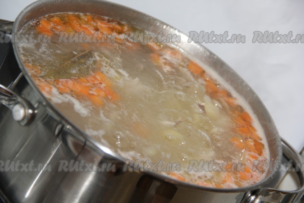 Обжаренные лук и морковь добавить в суп с картофелем и варить 10 минут до готовности овощей.