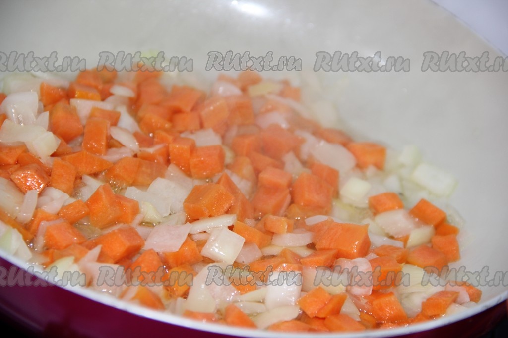 Лук и морковь почистить. Лук мелко нарезать, морковь нарезать на кубики. Обжарить овощи на растительном масле до золотистого цвета.