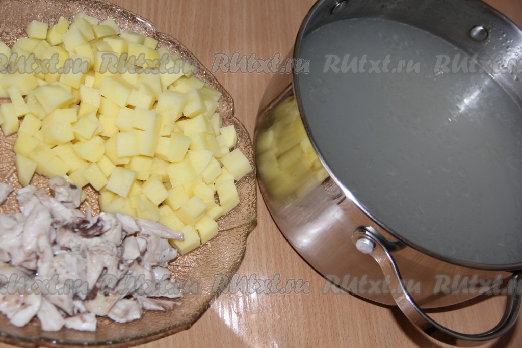 Бёдра помыть, положить в кастрюлю и залить водой (у меня кастрюля объёмом 3 литра). Поставить кастрюлю на огонь, довести до кипения, снять пенку и варить до готовности мяса. Достать из бульона бёдра, отделить мясо от костей и нарезать на кусочки. Очищенный картофель нарезать на кубики.