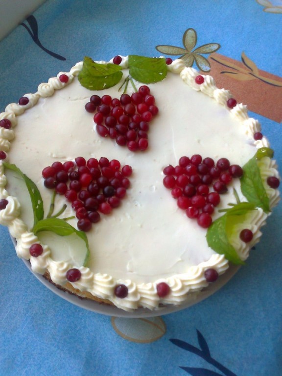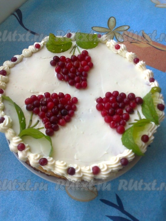 Верхний корж промазать только кремом, выровнять ножом. Немного крема оставить и украсить края торта "Гроздья рябины". Середину украсить ягодами клюквы и листочками мяты в виде гроздей рябины.