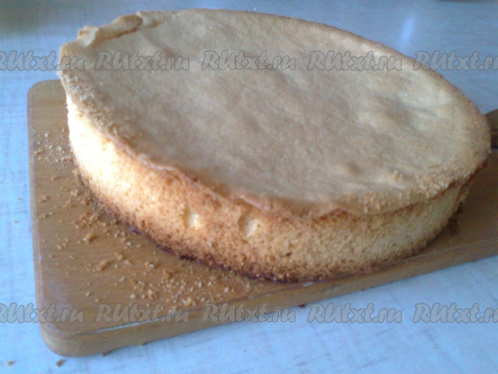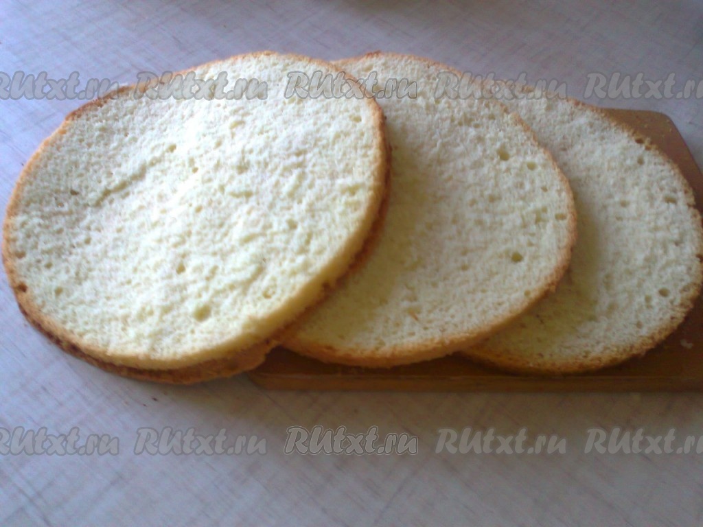 Затем надо смешать сметанный и белковый крем. Бисквитный корж разрезать на 3 части.