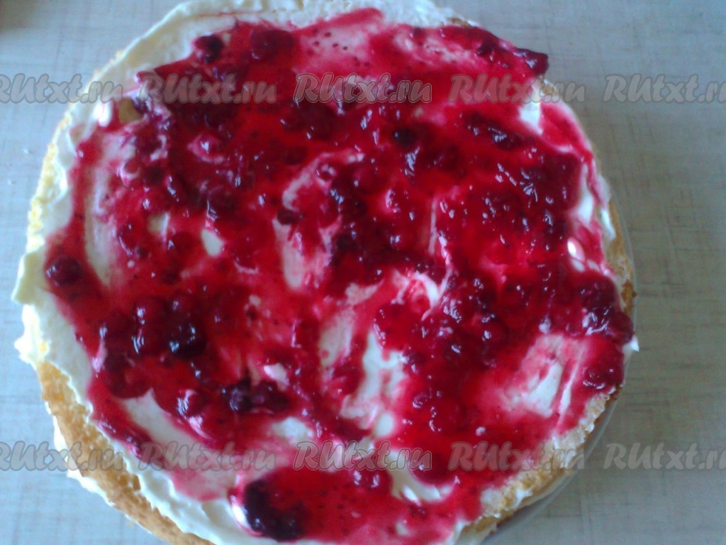 Сварить сироп из 100 мл воды и 100 граммов сахара. Пропитать коржи сиропом, промазать клюквой и кремом.