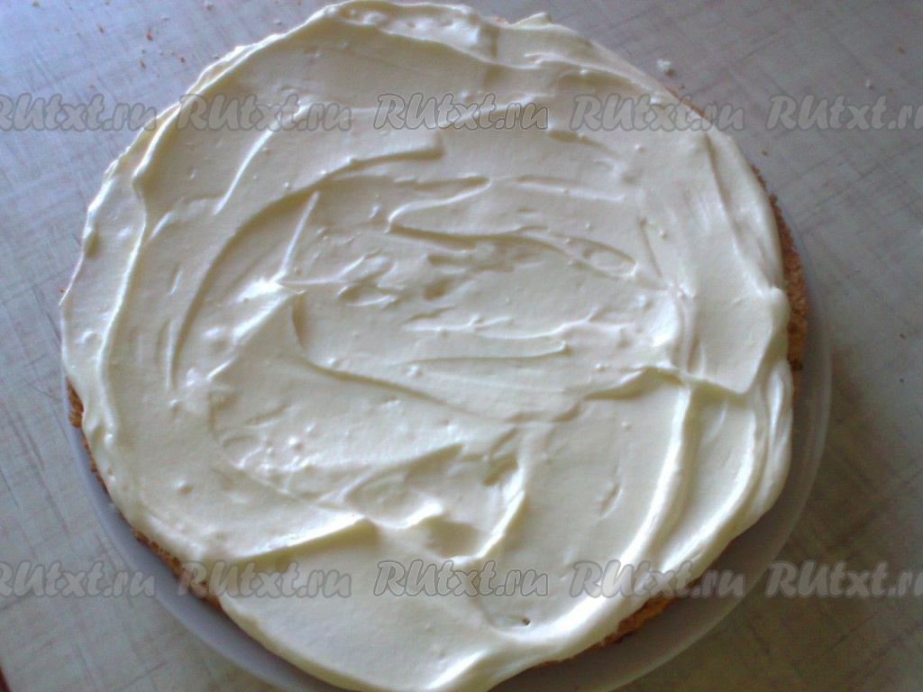 Приготовим сметанный крем. Застелить дуршлаг полотном, поставить его в миску и вылить в него 400 грамм сметаны. Дать стечь сыворотке (5 часов). Взбить готовую густую сметану со 110 граммами сахара. Можно заменить сливками.