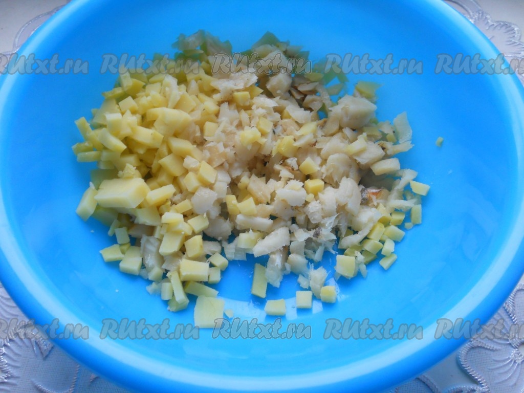 Филе отварной рыбы порезать мелкими кусочками. Картофель отварить в кожуре, остудить, очистить и нарезать небольшими кубиками.