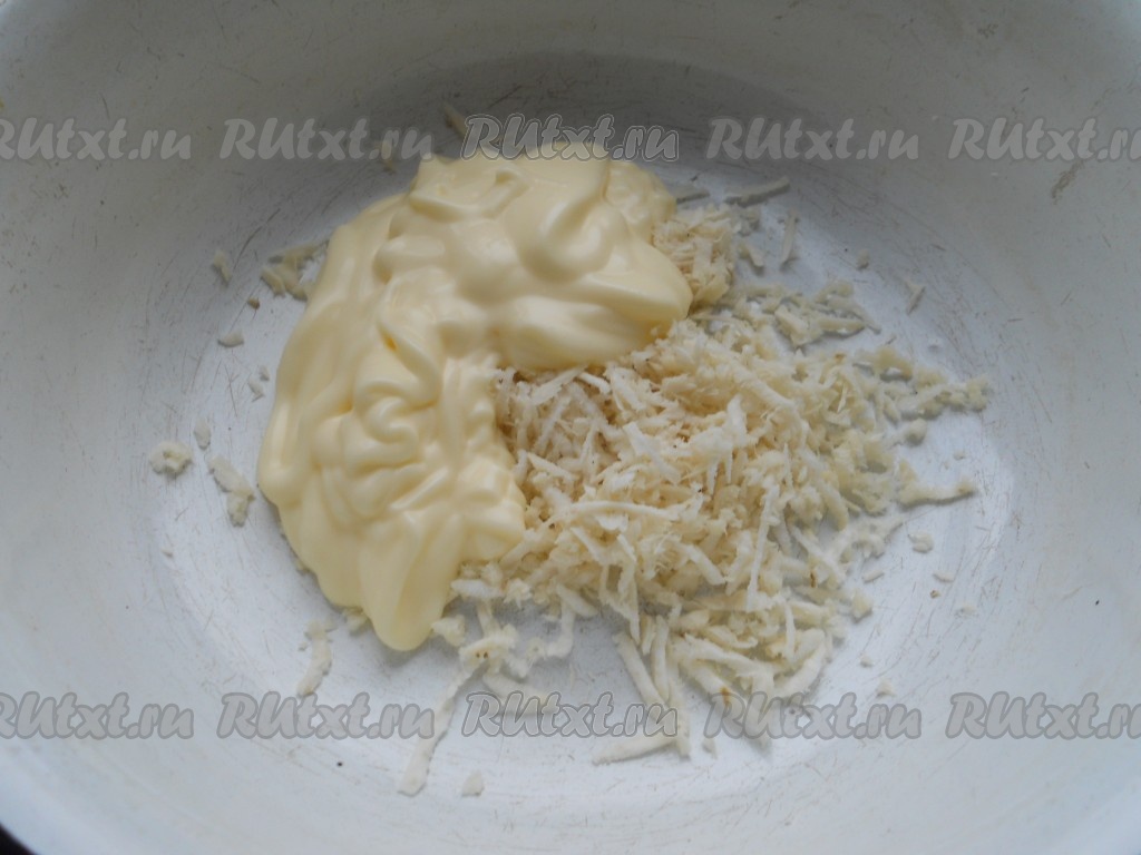 В отдельной мисочке смешать майонез и тертый хрен.
