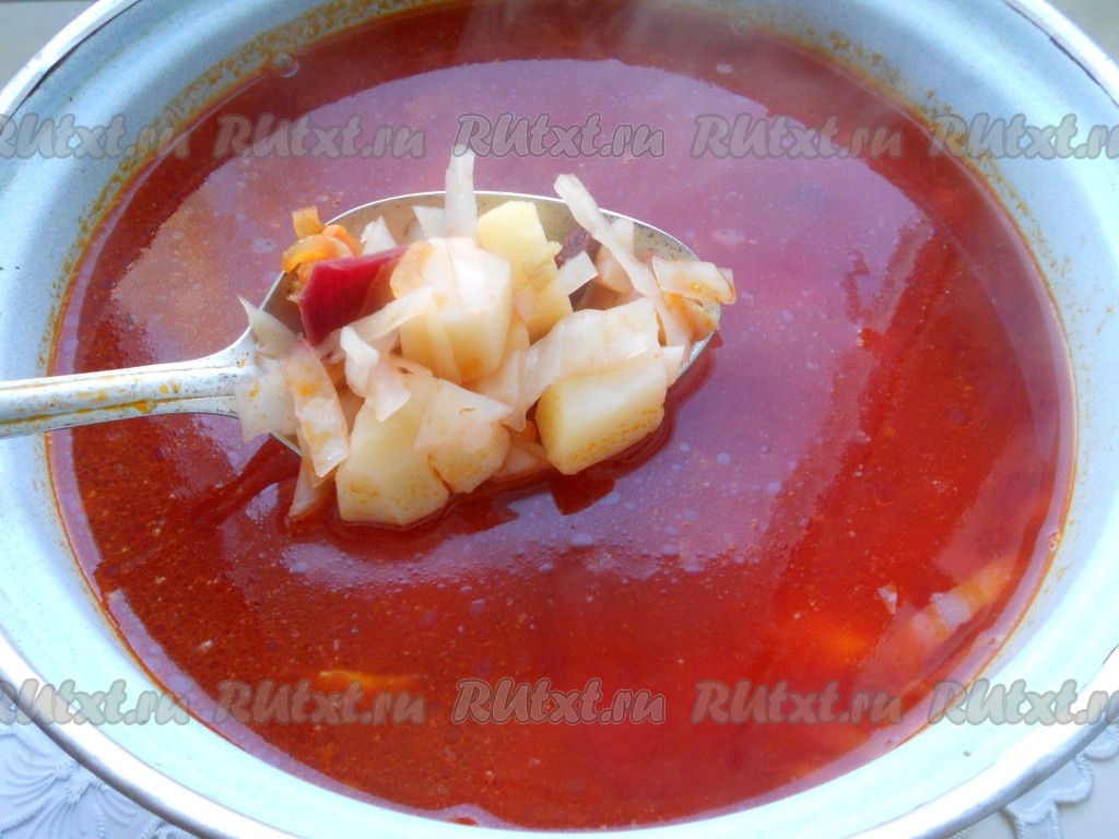 Далее добавить в кастрюлю морковь с луком, а затем выложить свеклу, перемешать. Поперчить, досолить, если понадобится. Довести борщ до кипения и варить его на небольшом огне 5 минут. Затем убрать с огня и оставить борщ под закрытой крышкой ещё на 20 минут.