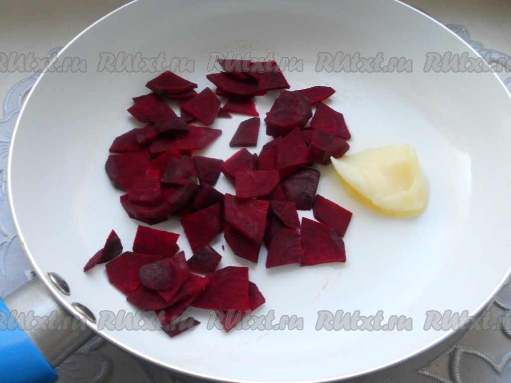 В другую сковороду поместить оставшийся куриный жир (или влить 2 столовых ложки растительного масла), добавить свеклу.