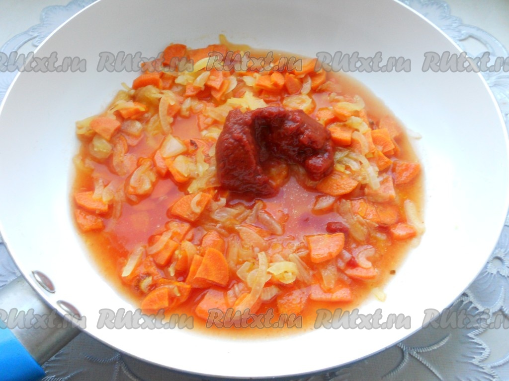 Обжарить лук на среднем огне, иногда помешивая, 3-4 минуты (до прозрачности), после чего добавить морковь. Жарить овощи вместе 3-4 минуты, периодически перемешивая. Затем влить немного бульона из кастрюли и добавить 2 столовых ложки томатной пасты, перемешать, дать закипеть и тушить на небольшом огне до мягкости моркови, периодически перемешивая.