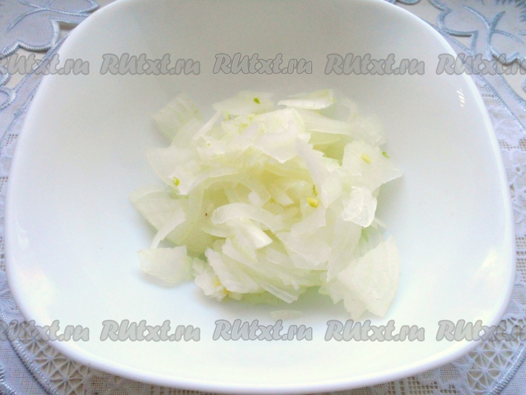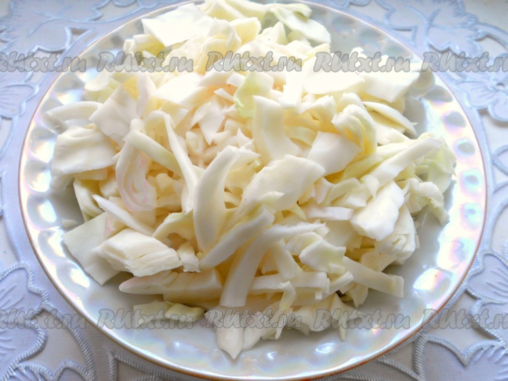Капусту нарезать на тонкие полоски (или шашечками).