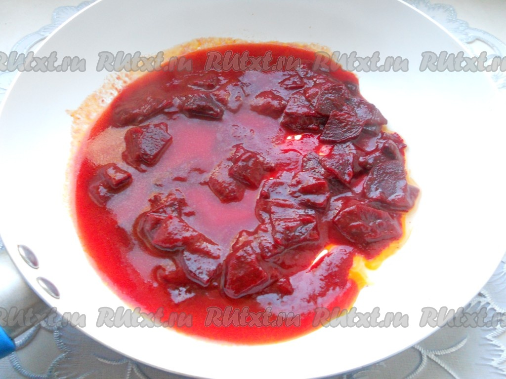 Обжарить свеклу на среднем огне 3-4 минуты, затем также влить немного бульона, положить оставшуюся томатную пасту, добавить лимонный сок и сахар, перемешать, дать закипеть, а после этого тушить на небольшом огне до мягкости свеклы (минут 15).