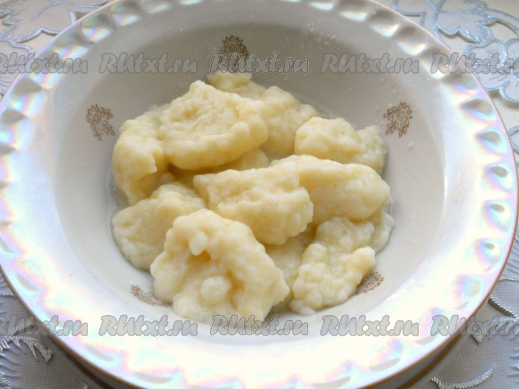 После этого частями всыпать оставшуюся муку, каждый раз тщательно вмешивая её в тесто для галушек.