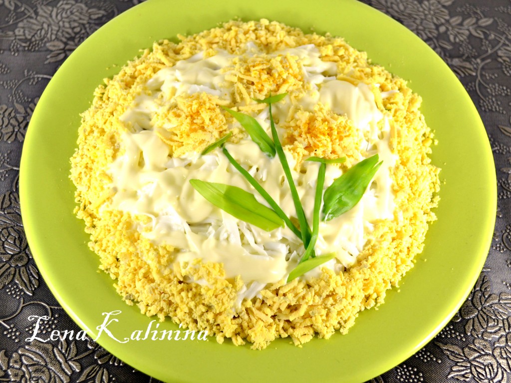 Покрыть салат сверху тертыми на мелкой терке желтками или украсить имитацией одуванчиков. Вот и все! Очень вкусный, нежный и воздушный салат "Одуванчик" поместить в холодильник на 2 часа и можно подавать к столу.