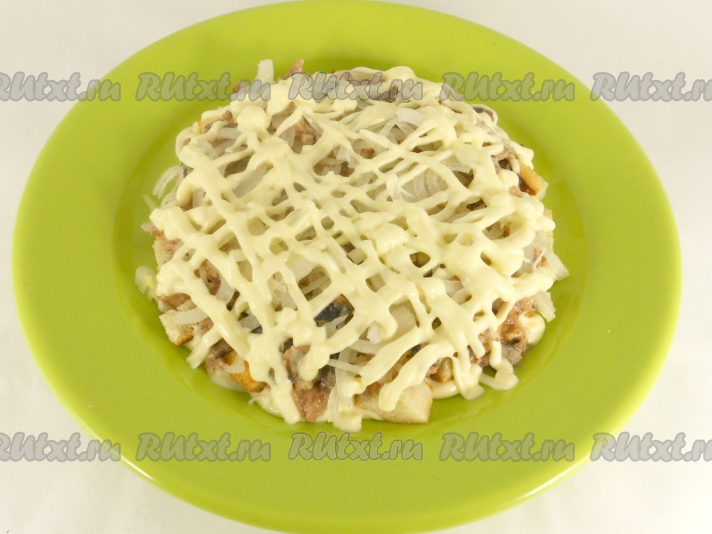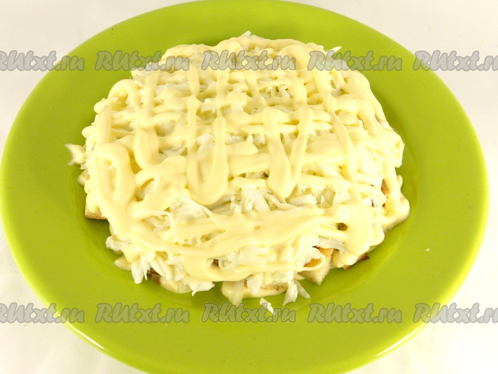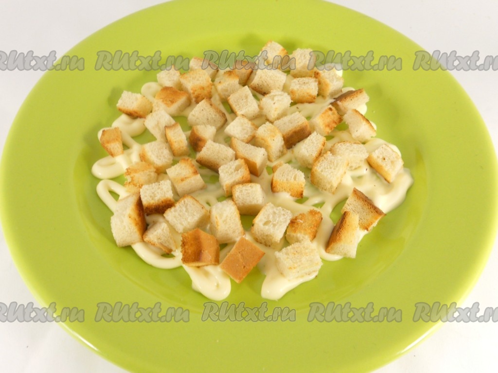 Ломти хлеба порезать маленькими кубиками. Обжарить их на сковороде с небольшим количеством (1 чайная ложка) растительного масла до легкой румяности. Остудить. Можно использовать и готовые сухарики в пакетиках, например, со вкусом красной икры. На дно круглой тарелки нанести сеточку из майонеза. Сухарики выложить на майонез первым слоем.