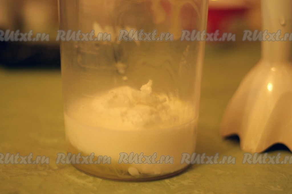 В чашу погружного блендера вбить сырое яйцо, выложить творог и влить молоко.