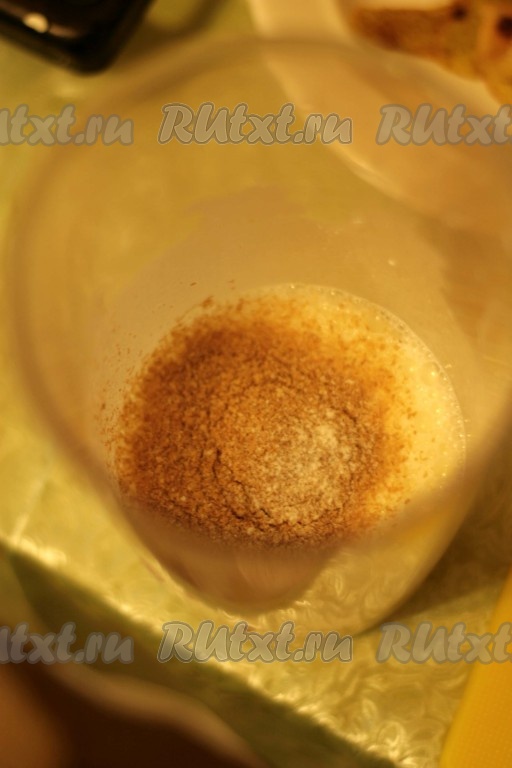 Пробить массу погружным блендером до однородности. Затем добавить сахар и манку, можно всыпать по вкусу корицу, ещё раз пробить погружным блендером.