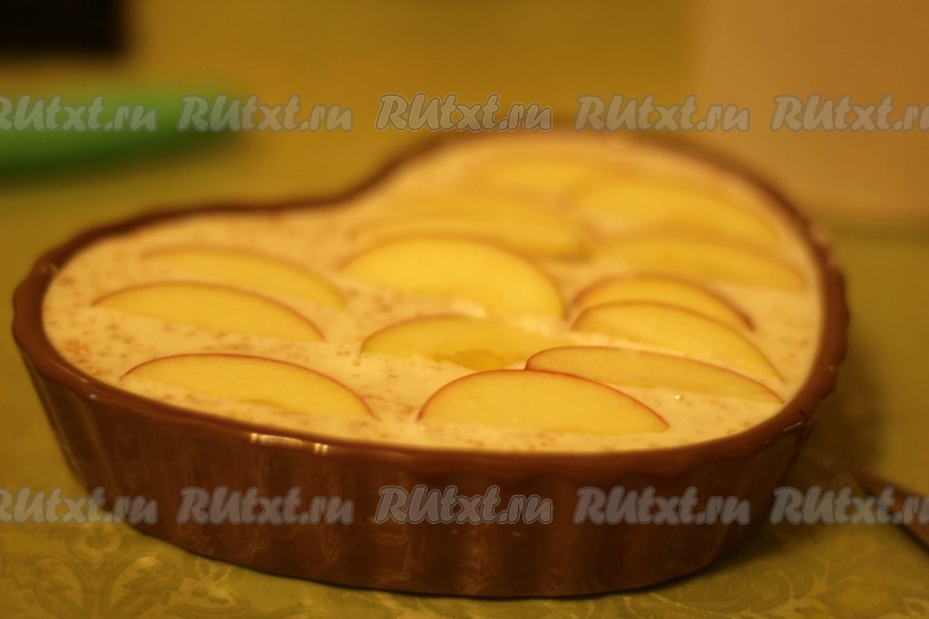 Яблоко нарезать на тонкие дольки и выложить в один слой поверх запеканки.