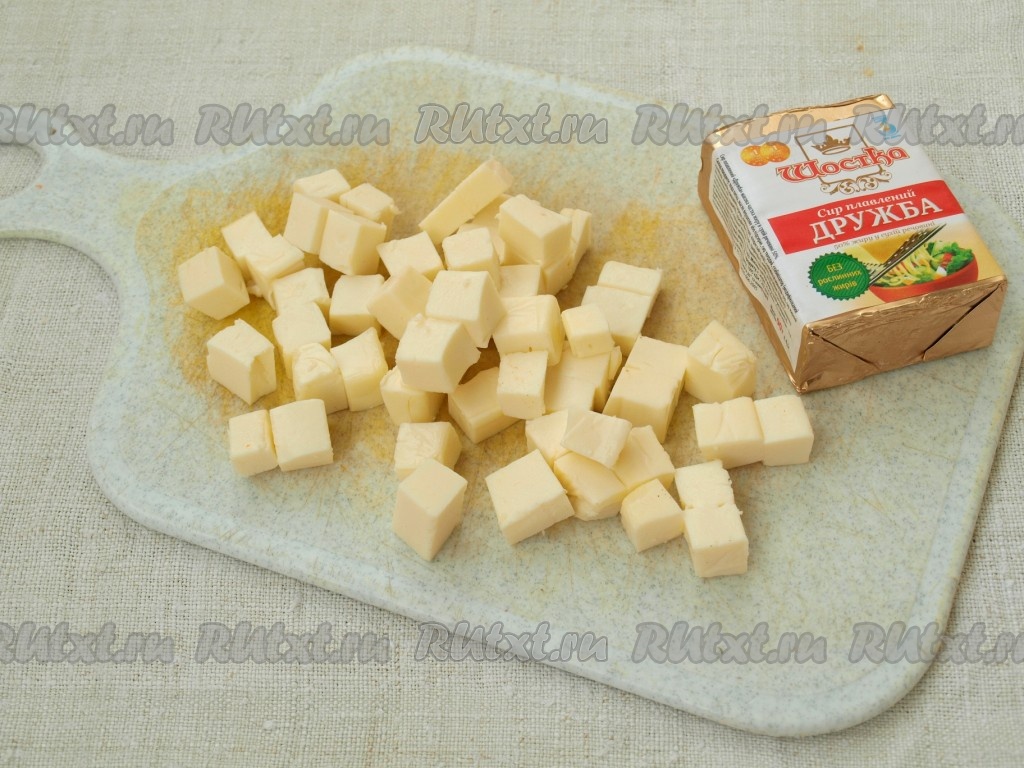 Нарезаем кубиками плавленный сыр. Морковь и лук нарезаем произвольно, так как они будут измельчаться в блендере.