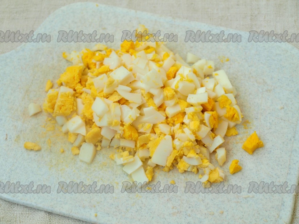 Также нарезать яйца.
