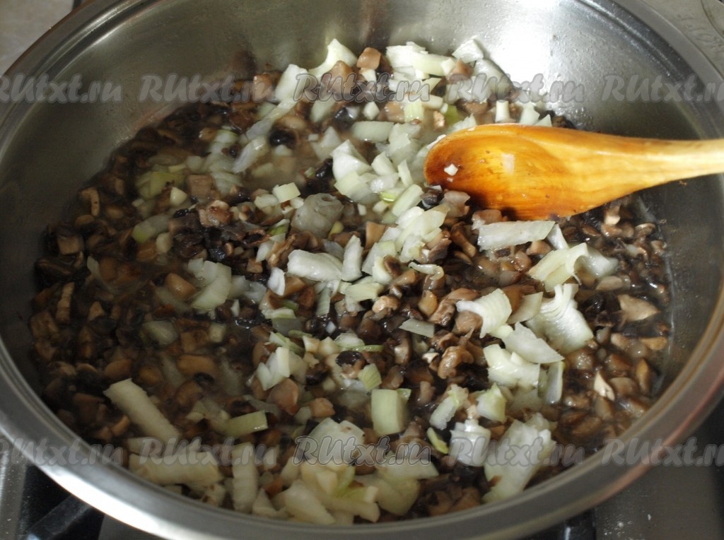 Нарезать мелко шампиньоны и лук, обжарить их на подсолнечном масле до готовности.