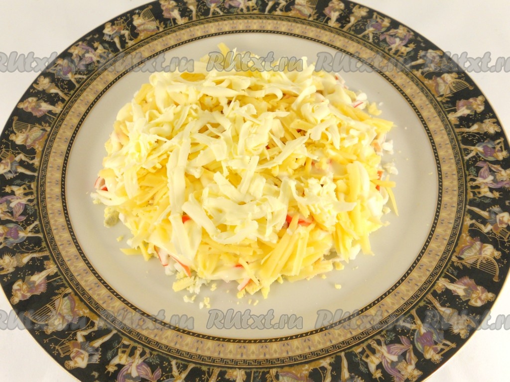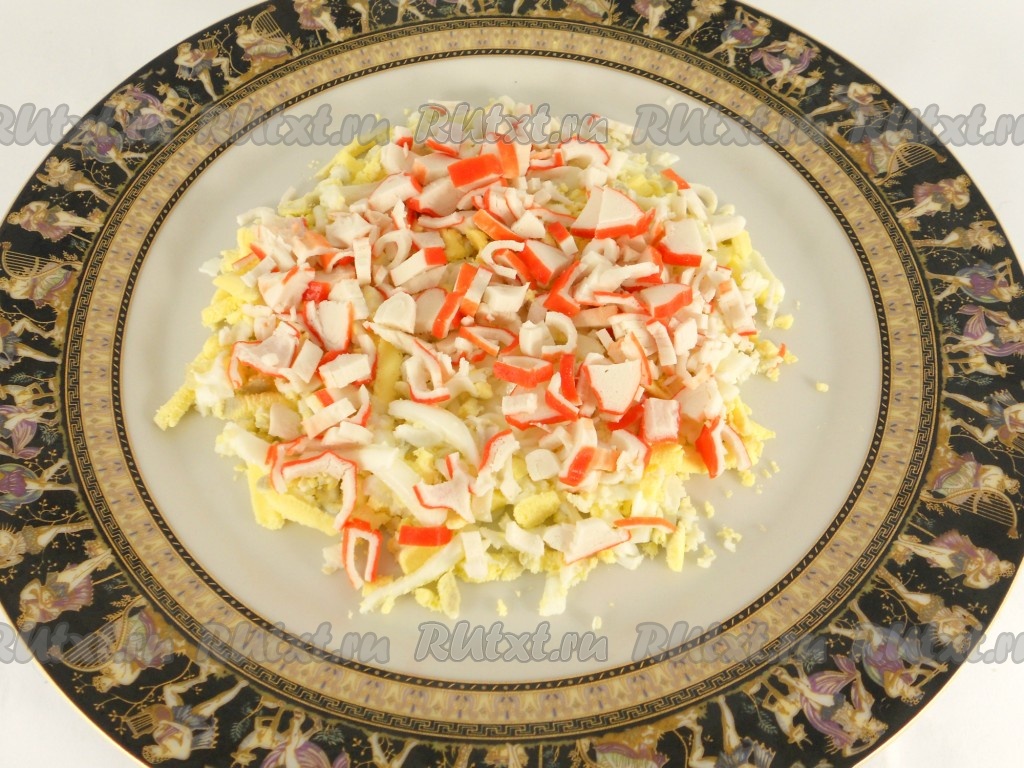 1-й слой - одно натертое на крупной терке яйцо + 1/3 часть мелко порезанных крабовых палочек + сеточка из майонеза.