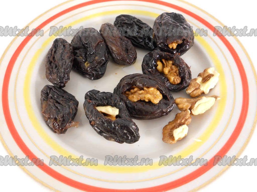 Воду слить, чернослив обсушить и в каждый - поместить по половинке ядрышка грецкого ореха.