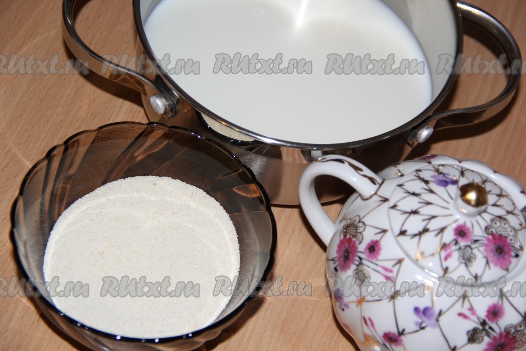 Прежде всего нужно сварить манную кашу, для этого 500 миллилитров молока нужно влить в кастрюлю, добавить щепотку соли, 1 чайную ложку сахара и поставить на огонь. Немного прогреть молоко и всыпать манку, постоянно помешивая. Довести кашу до кипения, не переставая помешивать, варить 3-5 минут на огне ниже среднего. Затем снять манную кашу с огня и остудить.