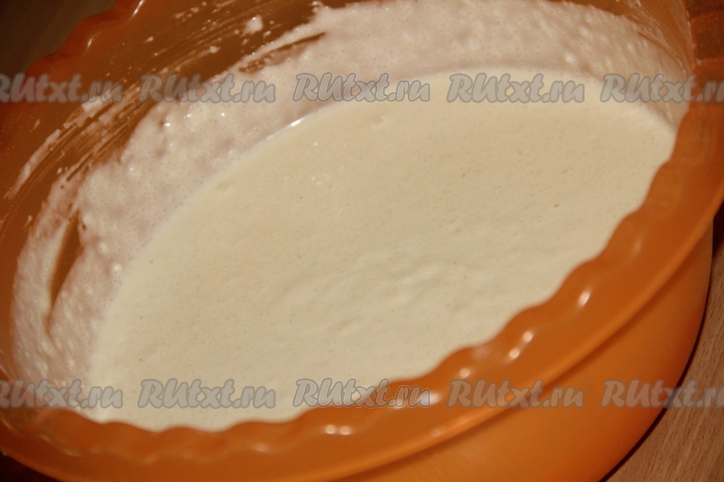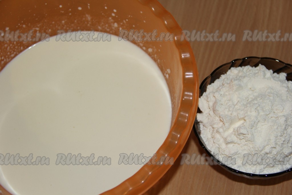 Подготовить опару, для этого в чашку влить 200 миллилитров тёплого молока (температура молока должна быть не выше 40 градусов), всыпать сухие дрожжи и добавить 1,5 столовых ложки сахара, перемешать и оставить на 15 минут, для того чтобы дрожжи ожили. По прошествии времени на опаре образуется шапочка, это значит, что дрожжи ожили.