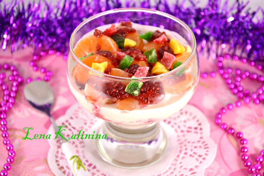 На мандарины - 2 чайные ложки малинового варенья. Украсить разноцветными цукатами. Поместить замечательный десерт из мороженого и фруктов в морозилку на 20 минут. Подать сразу же. Очень вкусно!