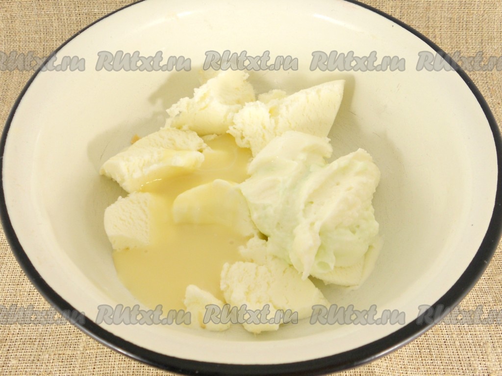 Смешать мороженое со сгущенным молоком и творожным кремом.