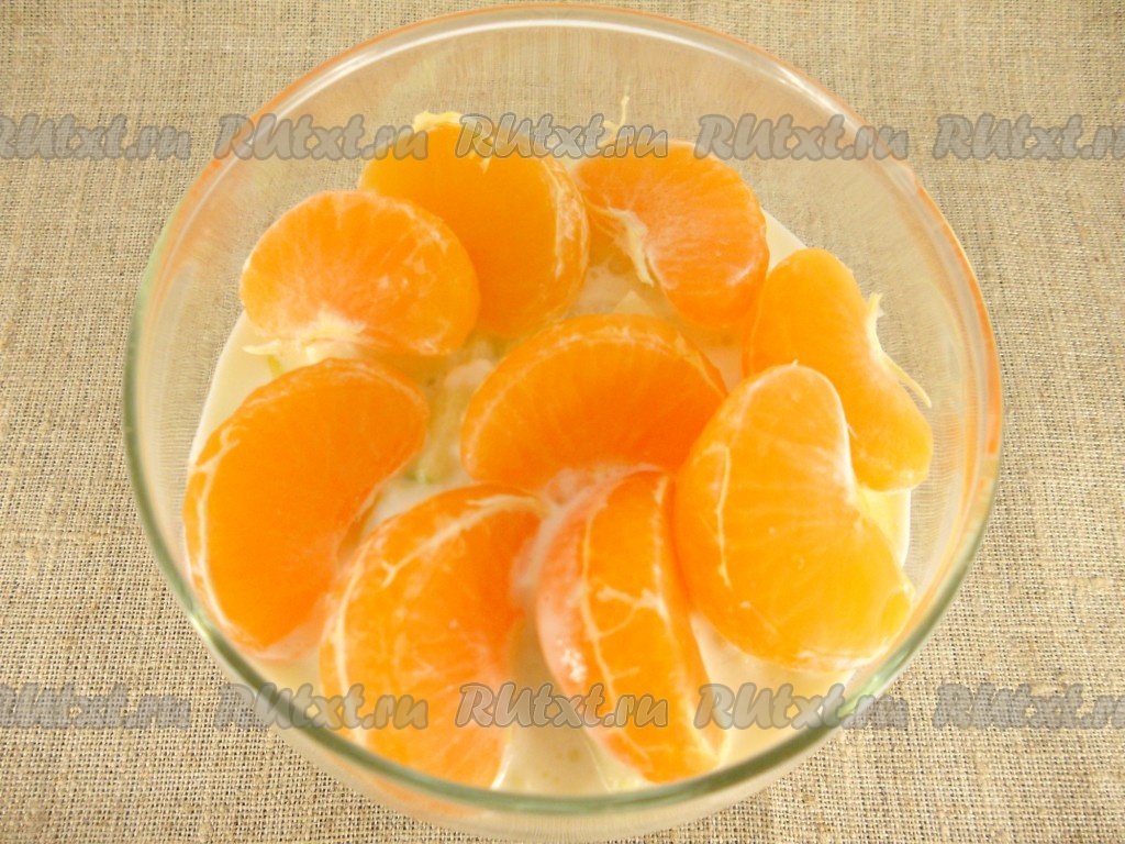 Далее, кубики груши + оставшаяся масса из мороженого, сверху - дольки мандаринов.