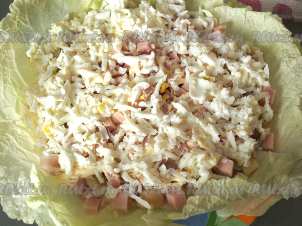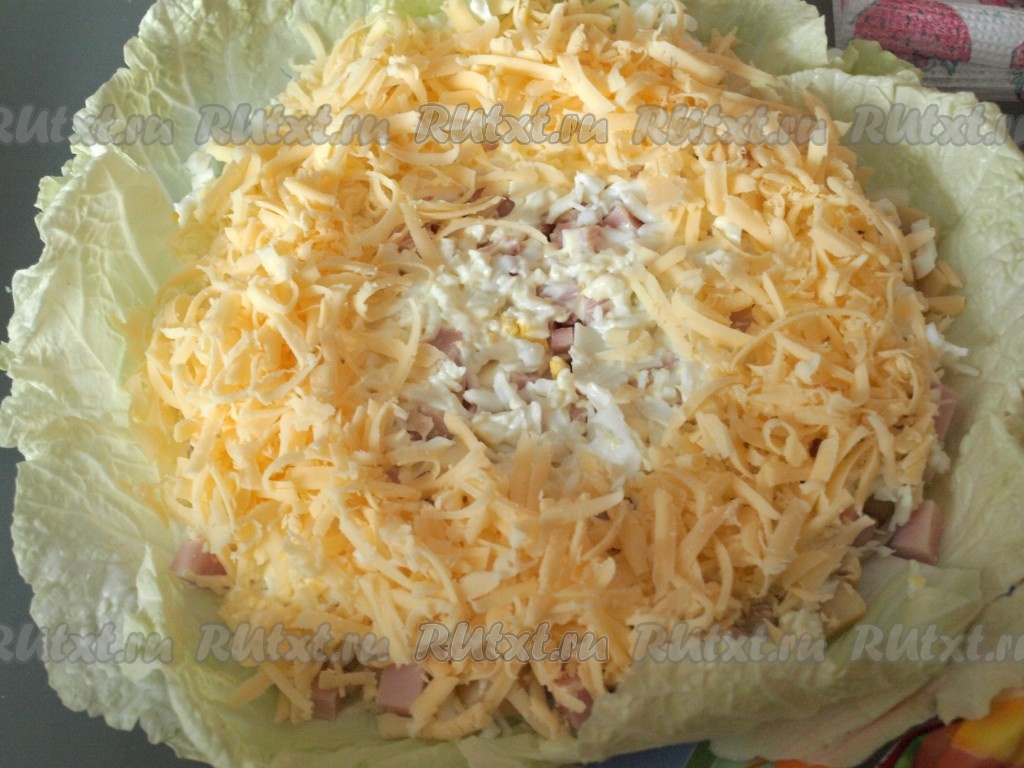 Выложить на блюдо листья пекинской капусты, сверху слоем - лук с шампиньонами.