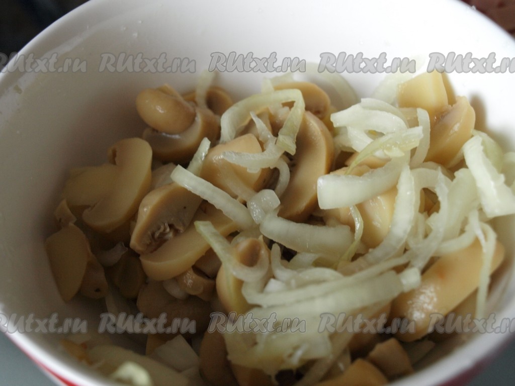 Лук тонко нарезать полукольцами. Залить лук кипятком, добавить сахар, уксус, перемешать и оставить на 30 минут, затем воду слить. Маринованный лук готов. Шампиньоны нарезать пластинками. Смешать маринованный лук и шампиньоны.