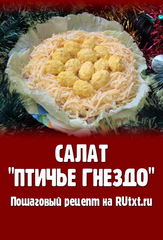 Оставшуюся часть сыра натереть на мелкой тёрке. Вилкой размять желтки и смешать их с сыром. Добавить пропущенный через пресс чеснок и немного майонеза. Хорошо перемешать и из этой массы слепить яйца. Выложить их в центр салата. Вкусный, эффектный салат "Птичье гнездо" можно подавать к столу.