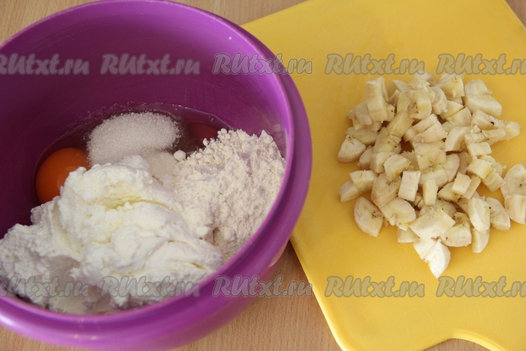 В миске соединить творог, яйцо, сахар и 2 столовых ложки муки, хорошо перемешать. Затем постепенно подсыпать оставшуюся муку, полностью вмешивая её в тесто. Творожное тесто должно получиться достаточно липким и вязким, но при этом, если сжать его в ладони, оно должно держать форму. Если после добавления 3 столовых ложек муки добиться нужно консистенции теста не получилось, добавьте ещё немного муки, регулируя густоту теста, но при этом не забивая тесто лишней мукой. Банан почистить и нарезать на небольшие кусочки.