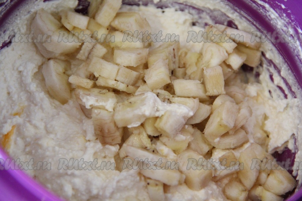 Кусочки банана добавить в творожную массу и аккуратно перемешать.