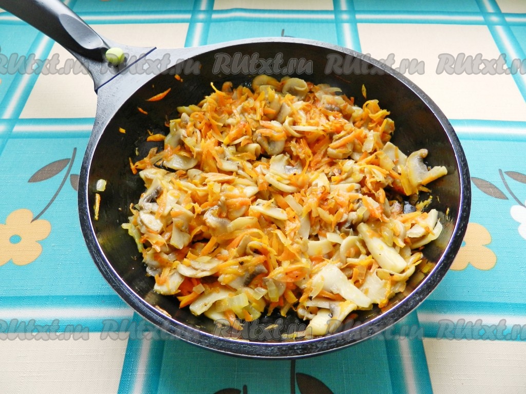 Затем добавить сливочное масло. Морковь натереть на терке, лук нарезать и выложить в сковороду к грибам.