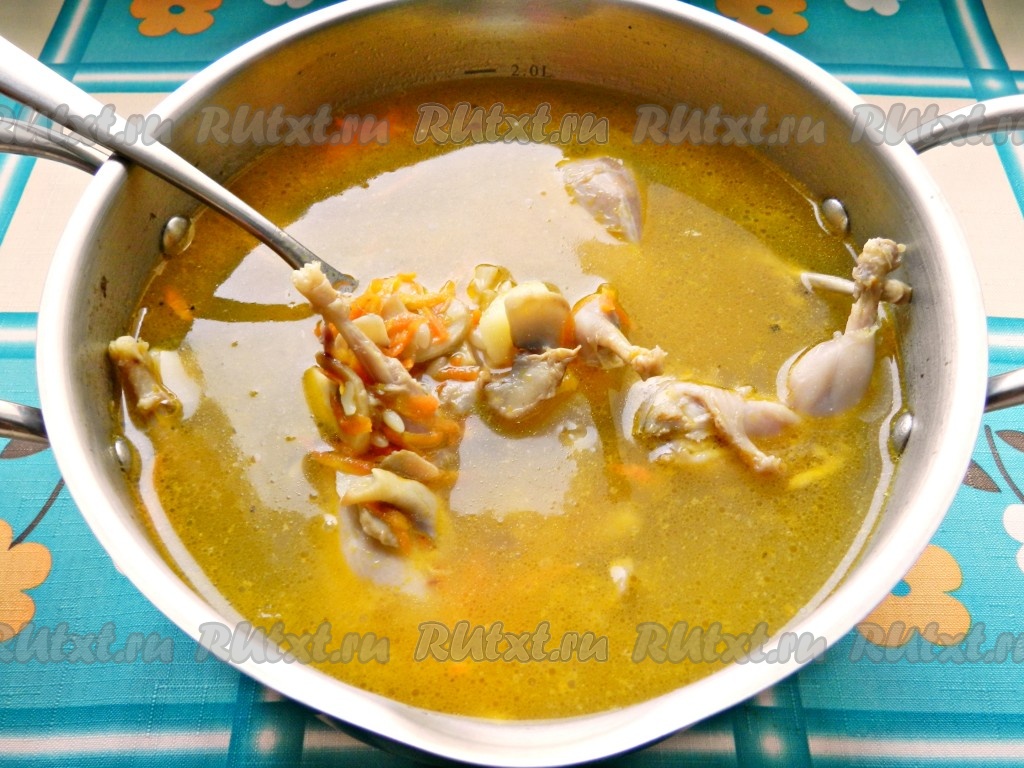 Когда бульон сварится, добавить картофель и варить его почти до готовности. Всыпать пасту, варить еще 7 минут. Затем выложить в кастрюлю шампиньоны с луком и морковью, поварить еще 2 минуты и снять суп с огня.