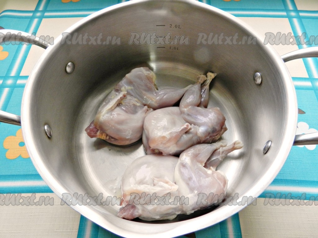 Перепелов вымыть, удалить кожу, положить в кастрюлю и залить двумя литрами холодной воды. Довести до кипения, снять пену и варить на медленном огне 1 час.