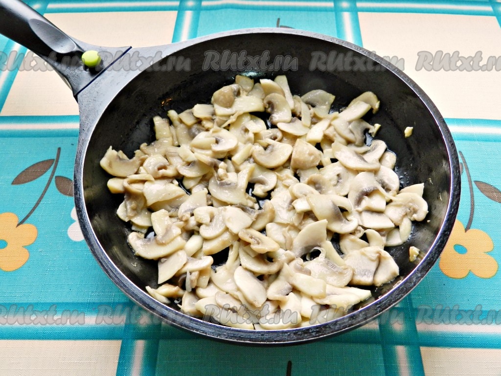 Шампиньоны нарезать пластинками, обжарить на небольшом количестве растительного масла до испарения жидкости.